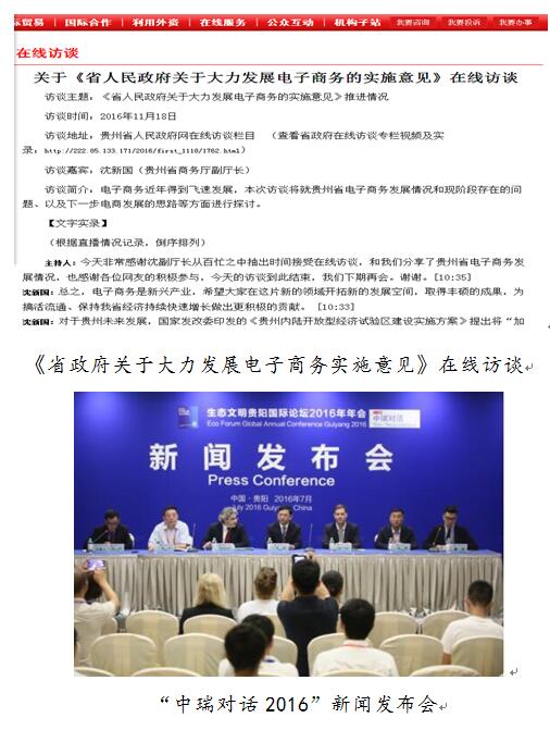 (一)健全省新闻发布与新闻发言人制度。 明确新闻发言人负责全省商务重大工作和热点事件的公开发布工作,对承办的大型活动和重点工作等及时通过召开新闻发布会和在报纸、电视台约发新闻等方式广泛向媒体和公众公布进展情况。我厅新闻发言人沈新国于 11 月 18 日接受贵州省人民政府网在线访谈, 就贵州省电子商务发展情况和现阶段存在的问题以及下一步电商发展的思路等方面进行探讨 。