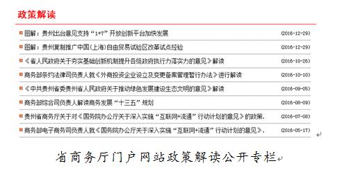 (三)在门户网站开设政策发布栏目,共发布政策文件及解读稿件 33 条。对国务院《关于促进外贸回稳向好的若干意见》、《关于深入实施“互联网 + 流通”行动计划的意见》等重大文件进行解读。