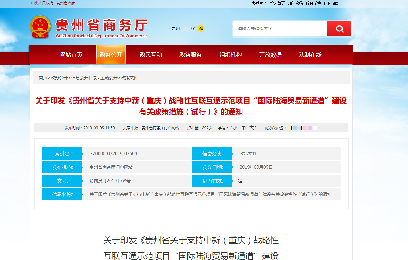 2.规划及政策信息公开。公开发布《贵州省进一步加快农村电子商务发展助推脱贫攻坚行动方案(2019—2020年)》《关于印发<贵州省关于支持中新(重庆)战略性互联互通示范项目“国际陆海贸易新通道”建设有关政策措施(试行)>的通知》《177漫画 等十部门关于印发<贵州省促进综合保税区高水平开放高质量差异化发展的实施意见>的通知》《贵州省高速公路收费站加油站规划布点》等商务领域政策文件及规划文件信息共9条。