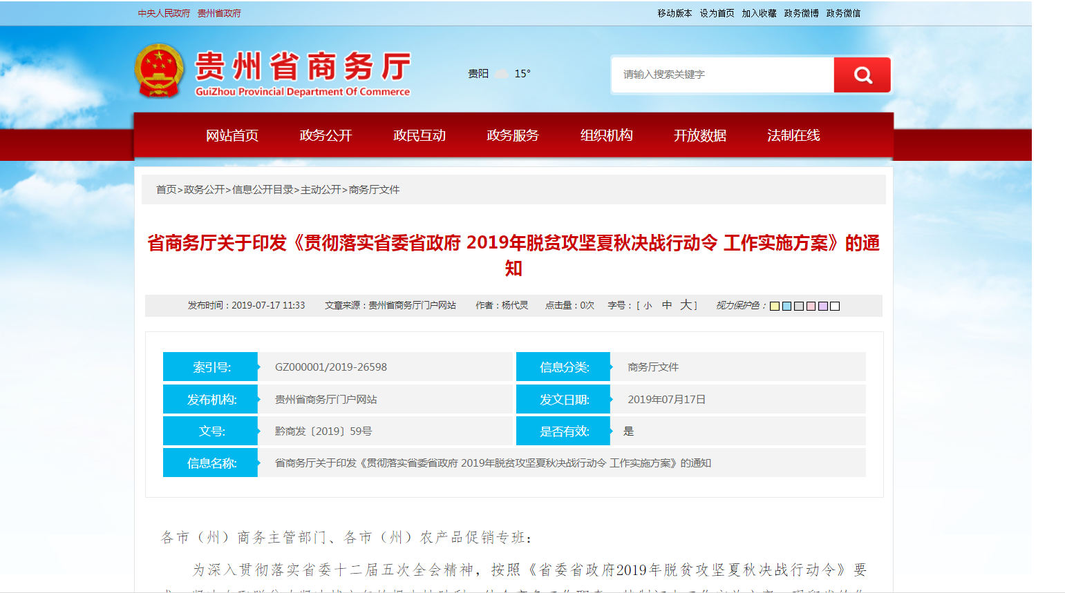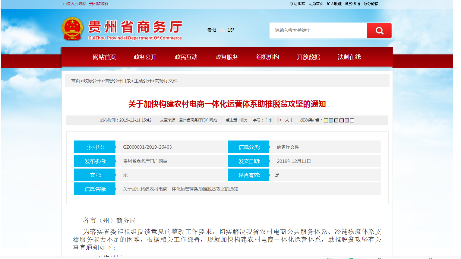 5.商务信息公开。在“工作动态”“177漫画公告 ”“商务厅文件”等栏目发布相关信息,公开发布了《关于加快构建农村电商一体化运营体系助推脱贫攻坚的通知》《177漫画 关于印发《贯彻落实省委省政府2019年脱贫攻坚夏秋决战行动令工作实施方案》的通知》《177漫画 关于印发贵州省推进冷链物流建设工作方案的通知》《关于做好省级农村电商公共服务平台应用推广工作的通知》《关于赴广州举办2019年贵州蔬菜粤港澳大湾区产销对接活动的通知》等通知方案,围绕扶贫、贵州绿色农产品促销工作、电商、冷链物流建设等工作,主动公开相关信息共100余条。